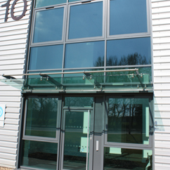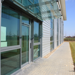Comar 6EFT mullion drained thermally broken curtain walling system in ‘stick’ construction with drained capping, pressure equalised and drained in accordance with BS6262, was installed to create large areas of natural lighting to the building. Comar 7 Pivot doors provided a 1000mm clear opening to meet DDA requirements. The doors were fitted with concealed overhead door closers with a 90º hold open facility, maximum security hook locks, full height handles and anti-finger trap jamb stiles.