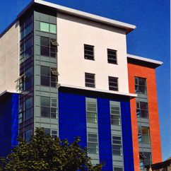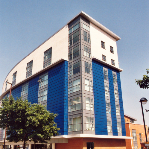 The design of the envelope using different textures and facade materials resulted in this eye-catching development. Creative use of aluminium provided the glazed facade, whilst blue rain-screen paneling created texture into insulated rendered brickwork. Due to the nature of this project, Comar Architectural Aluminium Systems were involved at an early stage to provide design drawings and fixing advice for the project.
